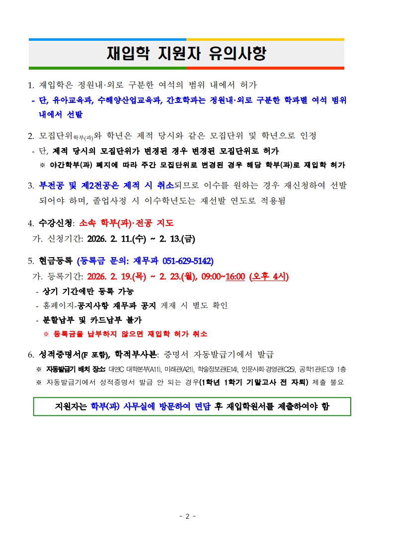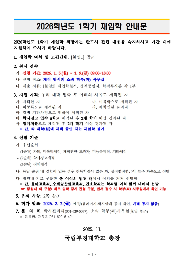 2026학년도 1학기 재입학을 안내하오니 참고 바랍니다.