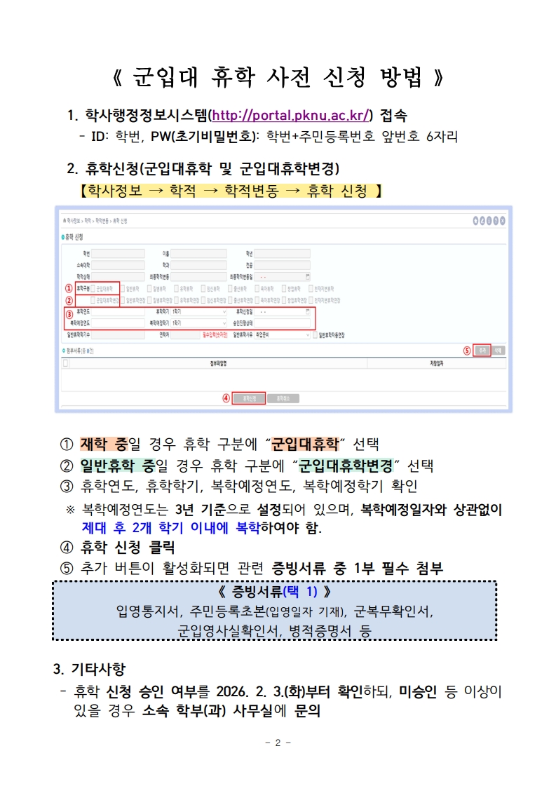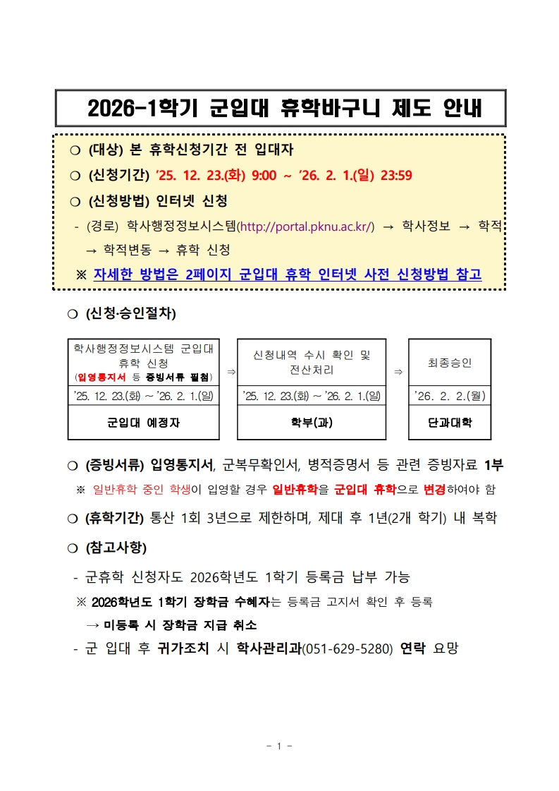 2026학년도 1학기 군입대 휴학바구니(사전휴학) 신청 안내