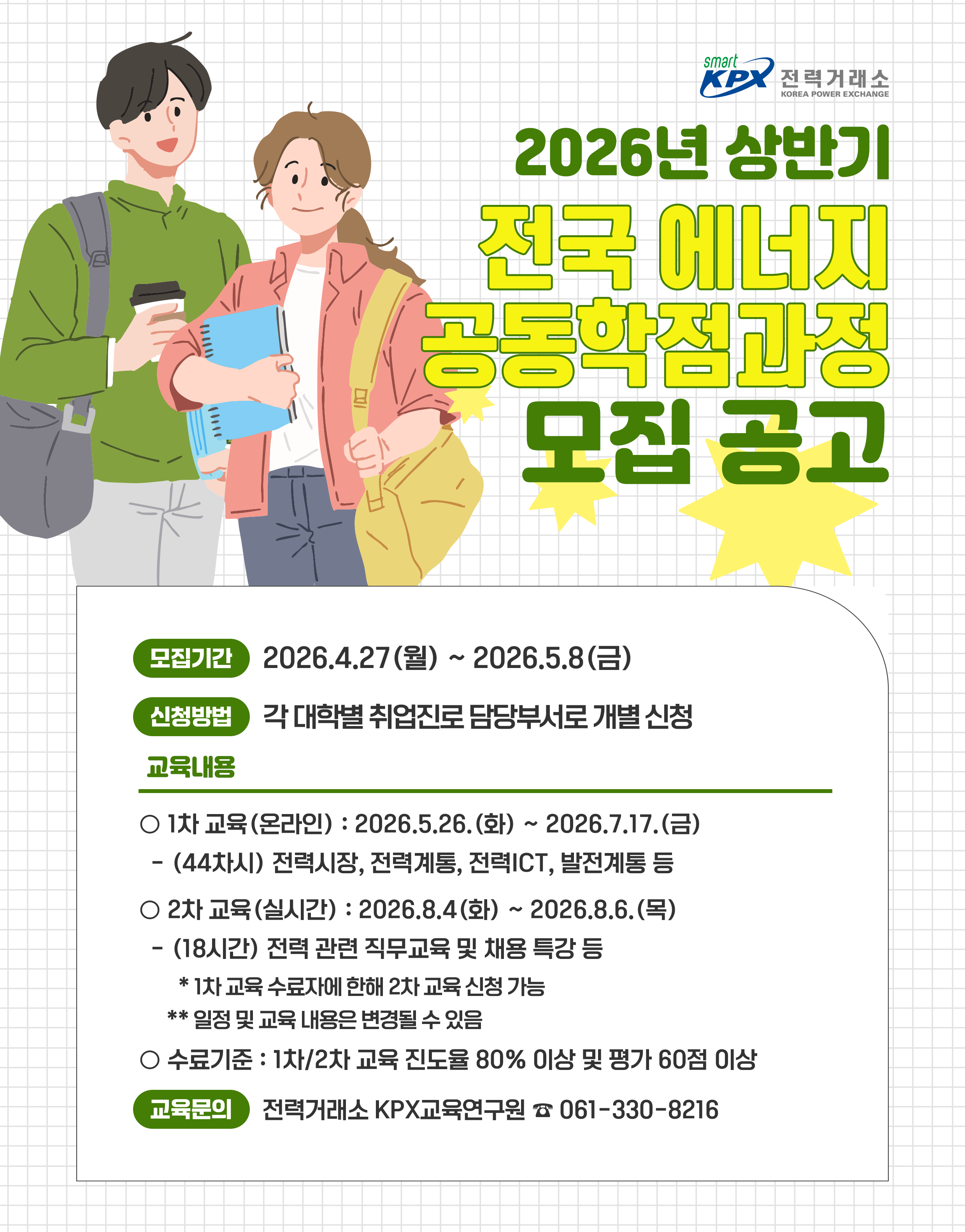 전력산업 인재양성 및 청년취업 지원을 위한 2026년 상반기 전국에너지공동학점과정 수강대상자를 모집하오니 희망학생은 신청 바랍니다.
