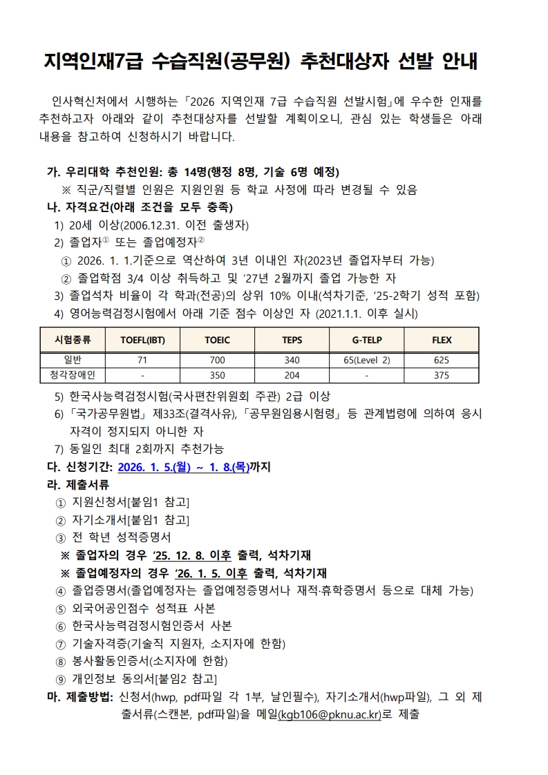| 2026년 지역인재7급 수습직원(공무원) 추천대상자 선발 안내 | |||