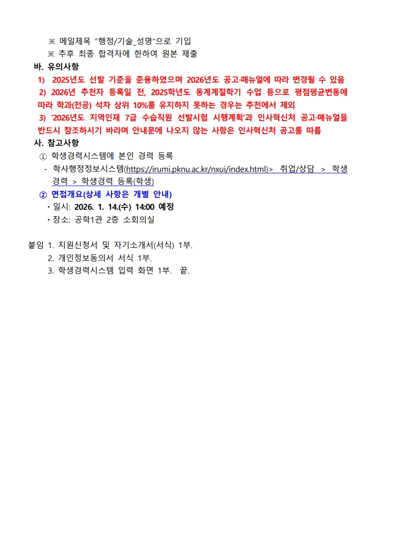 | 첨부파일 | 1. 지역인재7급 추천자 선발 안내문.pdf 2. 지원신청서 및 자기소개서 서식.hwp 3. 개인정보동의서 서식.hwp 4. 학생경력시스템 입력 화면.jpg | ||