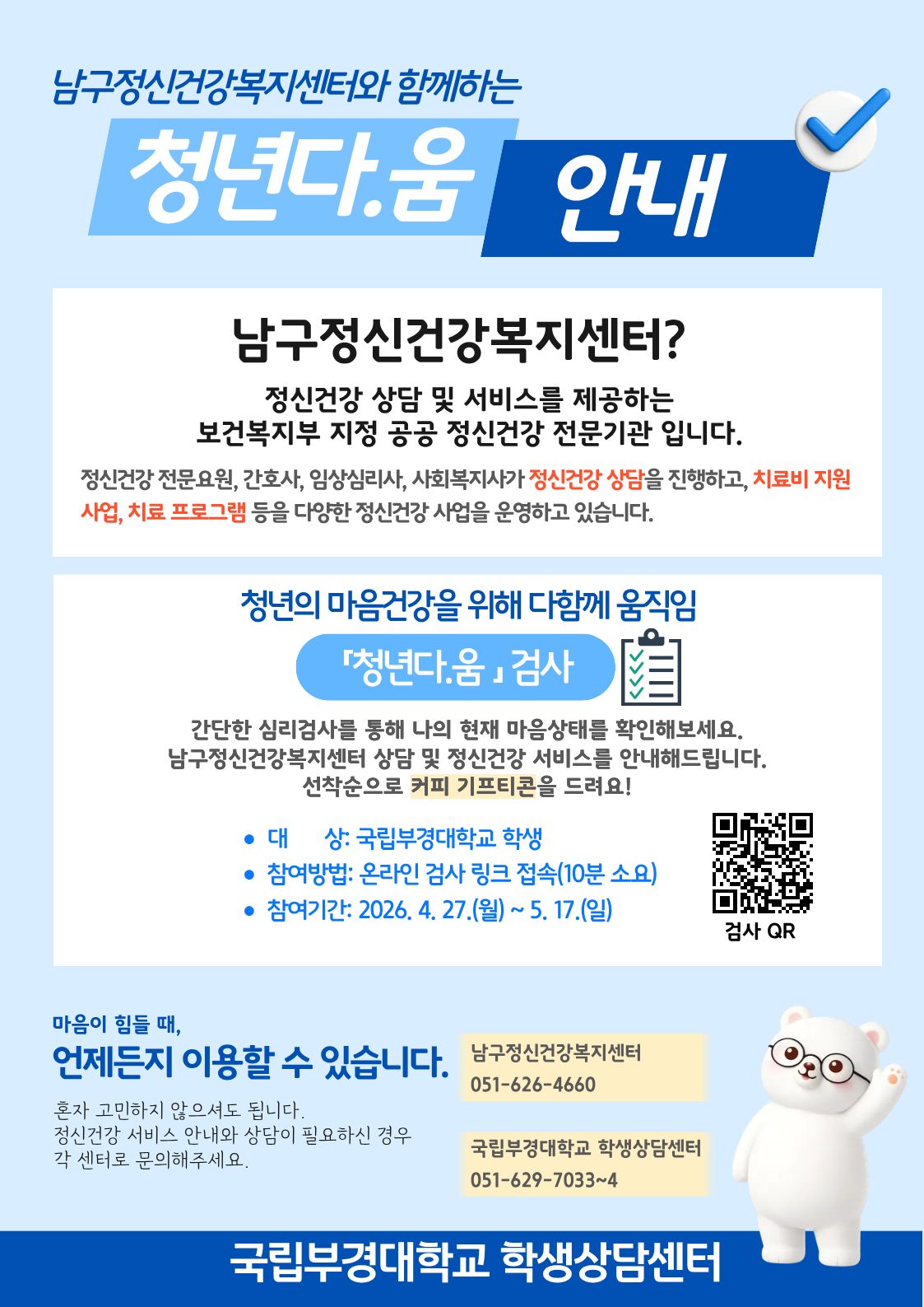 . 학생상담센터에서는 보건복지부 산하 남구정신건강복지센터와 협조하여 재학생 대상 정신건강 선별검사「청년 다.움」를 실시하고, 고위험군 학생을 선제적으로 발굴하여 심리적 지원을 하고자 합니다. 이에 학생들의 많은 참여 바랍니다.